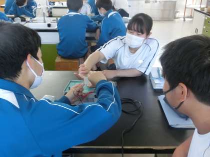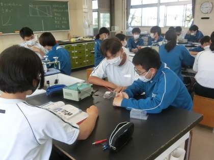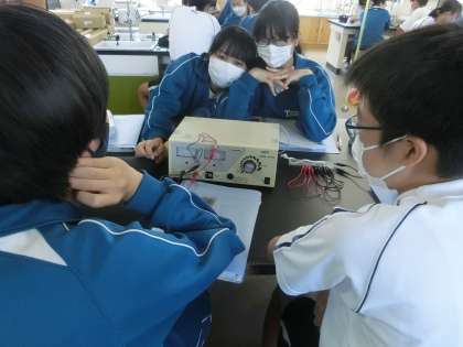 教科書にも掲載されている電気エネルギーを練るエネルギーに変える「ペルチェ素子」を実際に使い、エネルギーの移り変わりを体感していました。