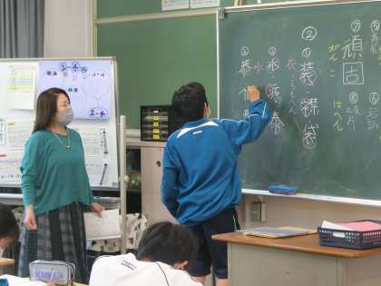 反対の意味の漢字や難しい漢字の読み方などを確認していきます。その後、部首の成り立ち、形は違えどもとは同じ漢字から変形した部首を探していました。