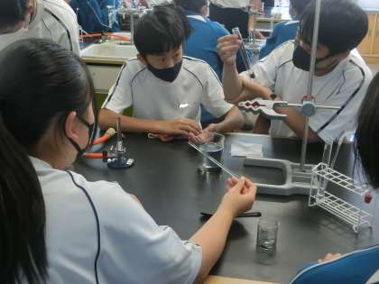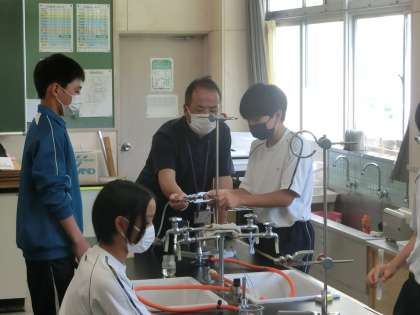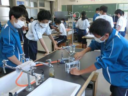 装置を組み立て、丁寧な作業手順で実験をしていました。