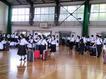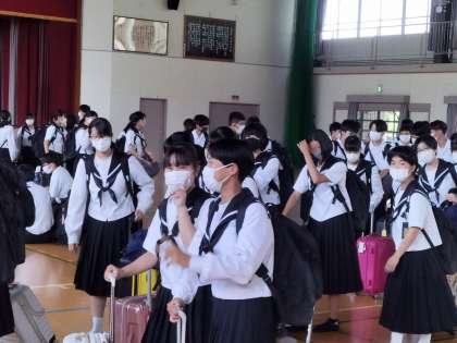 元気なあいさつで始まった出発式を終え、いよいよバス乗車・旅の始まりです。