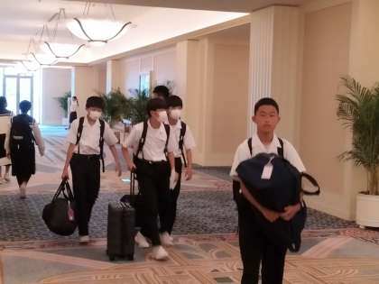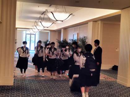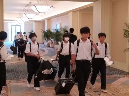 朝食会場に向かう生徒たちです。ぐっすり眠れたようで、朝から元気よくあいさつを交わしていました。