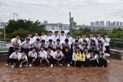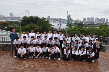 クラス別研修の様子です。 写真は、お台場に立ち寄った1組と3組のクラス写真です。