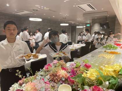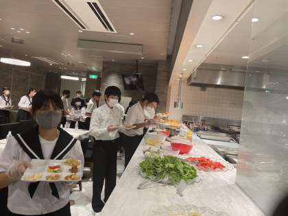写真は、ビュッフェ形式で昼食を楽しむ4組です。