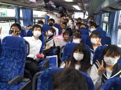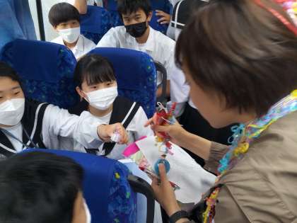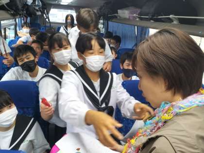 2組のバス車内では、SA休憩を利用して、生徒が事前に計画していた担任の誕生日のお祝い会が始まりました。