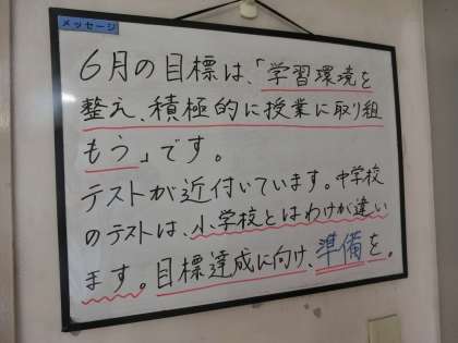 ホワイトボードのメッセージには、6月の目標が掲げられています。