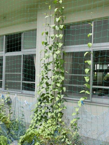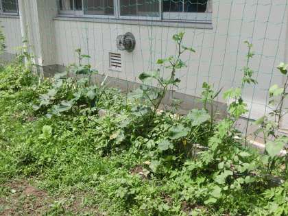 1年生の教室前の花壇に植えられたキュウリなどのつる科の植物。これは技術科の授業で、栽培の学習のために植えられたものです。おいしいキュウリづくりに必要な知識を学んだり、生き物を根気よく世話したりする2つの大切な活動です。また、これから暑くなる時期に向けて、グリーンカーテンとしても役立っていきます。