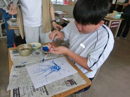 画用紙に絵の具をたらし、ストローで拭いたり、筆をはじいたりして意図的ではないデザインを組み合わせていきます。色を考えたり、息を吹きつける方向を工夫したりして、楽しみながらオリジナルの作品づくりに取り組んでいました。