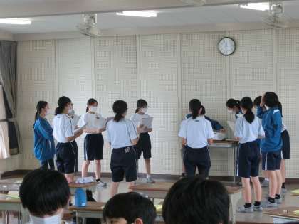 合唱のつくり方について、「夢の世界を」という曲を題材に、それぞれが見つけ出した内容を発表し合っていました。