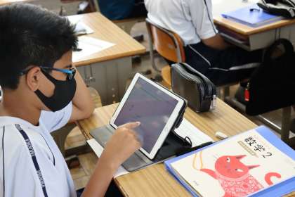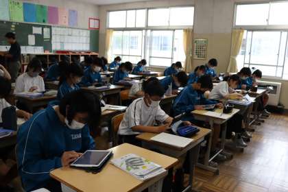 学習用タブレットの学習ソフト「 Qubena 」を活用して、これまでの単元の復習が行われていました。