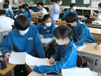 『作られた「物語」を超えて』という題材を使い、「筆者の主張と論理の展開を図式化して伝えよう」をテーマに、ペア同士での発表が行われていました。