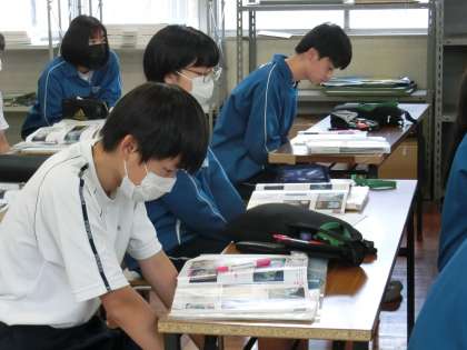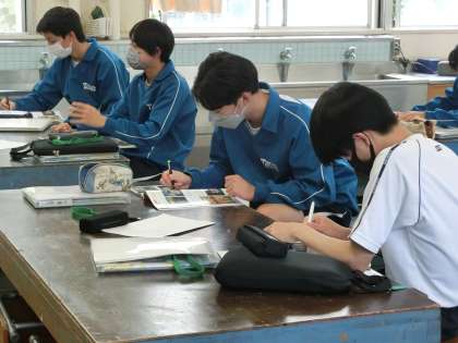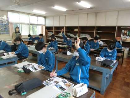 「空想画を描こう」がテーマの作品づくりに向けて、まずはお手本となる作品の鑑賞です。様々な技法やデザインのアイデアなどを参考にし、今後、オリジナルの作品づくりに取り組んでいきます。