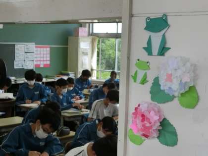 6/8 季節に合わせて… 公開日 2023/06/08 更新日 2023/06/08 校長室から 3年生の教室の出入り口に、季節を感じる掲示物を発見しました。 うっとおしいと言われる梅雨の時期もこうした作品が一つあるだけで、ずいぶん気分も変わります。