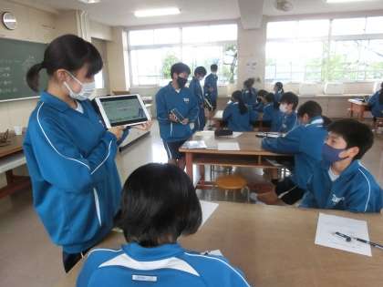 「分かりやすく」を極めるため、説明や画面の見やすさを工夫しています。グループのメンバーも興味をもって仲間の発表を聞いていました。