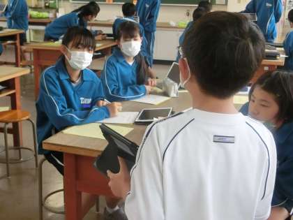 「繊維について分かりやすく発表しよう」をテーマに、これまで個人で調べてきた内容をパワーポイントを作成して発表していました。