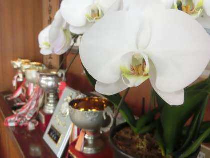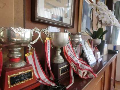 校長室に併設している会議室の棚には、これまで本校生徒が部活動の大会で獲得したたくさんの優勝カップが並んでいます。来校されるお客さんの目にふれる位置にあるため、学校の誇りにもなっています。