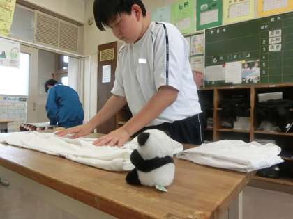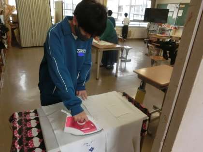 1,2学級の月曜日の1時間目は、給食のエプロンにアイロンがけを行うのが習慣になっています。