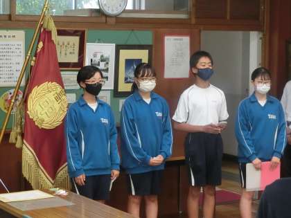 今年度に入り初めての表彰伝達となります。読書感想画や読書感想文の入賞、柔道(クラブ)大会での上位入賞について、全校生徒への紹介も兼ねて行いました。