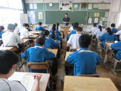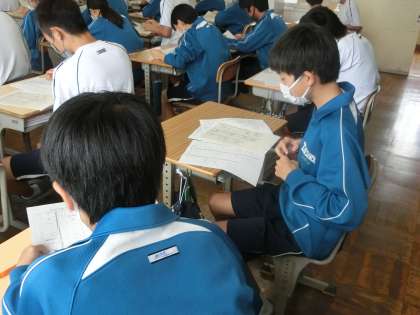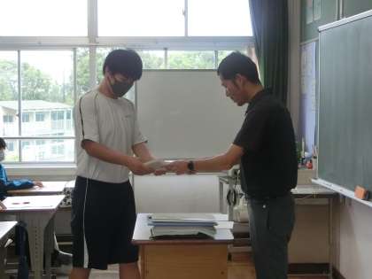 教科担任から両手でテストを受け取る生徒たち。点数だけに一喜一憂するのではなく、取り組みからをしっかりと振り返り、自身の進路実現に向けて努力を続けてほしいと思います。