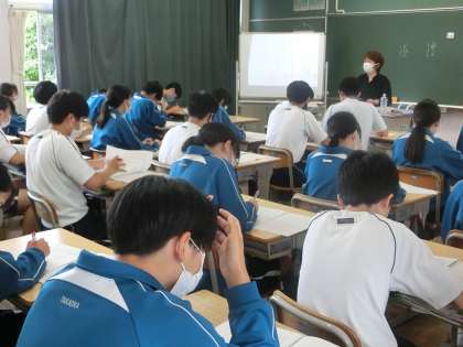 教科担任の解説を熱心に聴く生徒たち。点数だけに一喜一憂するのではなく、取り組みからをしっかりと振り返り、自身の進路実現に向けて努力を続けてほしいと思います。