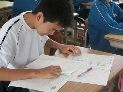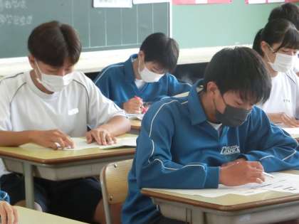 教科担任の解説を聴き、熱心に解き直しをする生徒たち。点数だけに一喜一憂するのではなく、取り組みからをしっかりと振り返り、自身の進路実現に向けて努力を続けてほしいと思います。