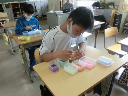 コースターや置き物を作成する特に使うアイロンビーズの色分けを行っていました。