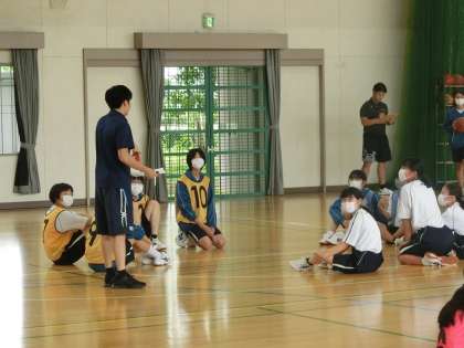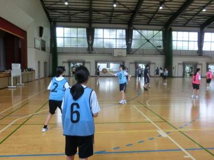 バスケットボールの単元で、「チームで話し合い、空いているスペースを活用してプレーしよう」をテーマに、練習とゲームが行われていました。