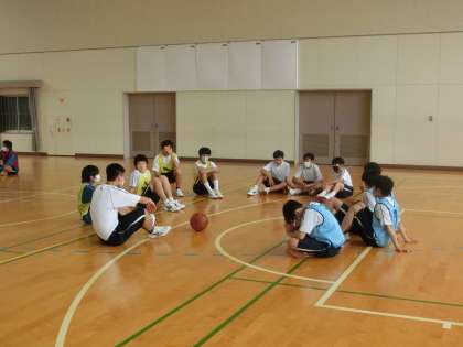 バスケットボールの単元で、「チームで話し合い、空いているスペースを活用してプレーしよう」をテーマに、練習とゲームが行われていました。