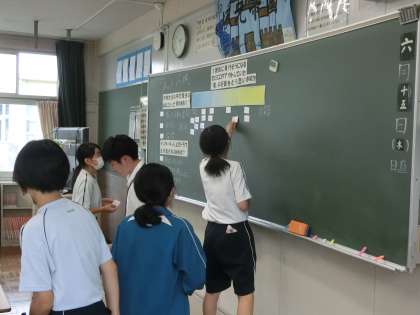 主人公の言動に「共感できる」「共感できない」と自身の気持ちを落とし込みます。日頃の生活や過去の経験を思い出し、選択した理由を述べている生徒もいて感心しました。