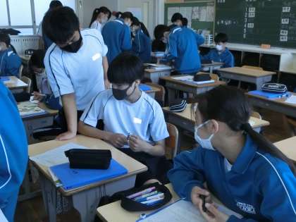 問題を解き始めてしばらくすると、仲間のところに行き、解答の確認や教え合う活動が自然と始まります。学習のスタイルが定着しているようです。