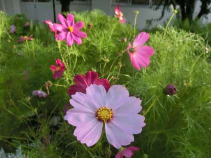 職員室前の花壇には、コスモスの花が咲いています。これは3年ほど前に植えたものが種を落として自生したもので、ここ数年はこの時期になるときれいな花を咲かせ、私たちの目を楽しませてくれています。植物の生命力を改めて感じるところです。
