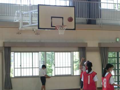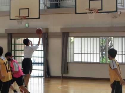 バスケットボールの単元で、「仲間と協力して戦術を考え、つながりのあるプレーをしよう」をテーマに活動が進められていました。