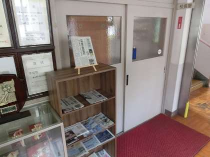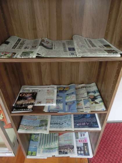 校長室の出入り口付近に設置してある本棚。前任の校長先生が生徒たちにお薦めの本を読んでもらおうと設置されたものです。今年度はその棚を新聞を読んでもらおうと思い、継続して活用しています。日刊・夕刊の新聞のほか、様々な特集が組まれる「日曜版」を置いています。
