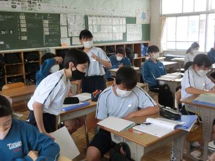 6/27 仲間から刺激を受ける 4 公開日 2023/06/27 更新日 2023/06/27 各学年から 昨日の2年1組の数学の授業の様子です。 連立方程式の単元で、「かっこつきの問題の解き方を完全マスター」をテーマに学習が進められていました。 仲間の解き方と自分の解き方を比べ、効率的で間違えの少ない方法を探していました。