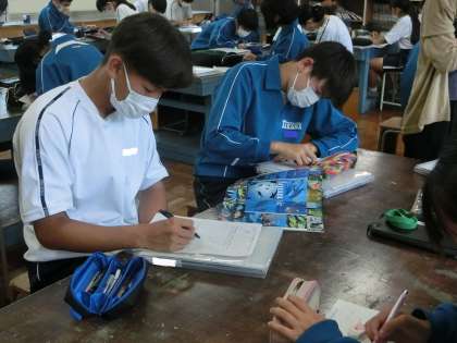 「空想画を描こう」の単元で、「主役と背景を決めよう」をテーマに活動が進められていました。