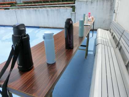 水泳の授業であっても、水分補給は必須。プールサイドに水筒を持ち込み、適宜休憩や水分補給を取りながら授業を進めています。