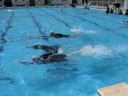 美しいフォームでの泳法をマスターするため、仲間と教え合いながら練習していました。