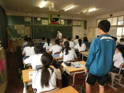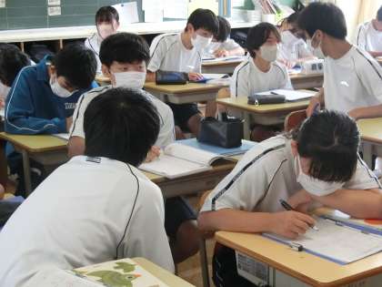 問題を解く時間になり少し経つと、解けた生徒が仲間のところに行き、解答の確認とヒントが必要であれば、丁寧に説明を始めています。アウトプット(=仲間に説明すること)で、考え方を確かなものにしています。