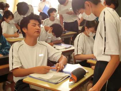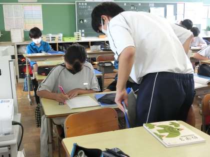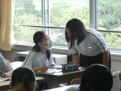 問題を解く時間になり少し経つと、解けた生徒が仲間のところに行き、解答の確認とヒントが必要であれば、丁寧に説明を始めています。アウトプット(=仲間に説明すること)で、考え方を確かなものにしています。
