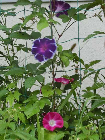 その中でひときわ目を引くのがアサガオ。赤や紫の花がとてもきれいに咲いています。この花を見るたび、小学校時代の観察の宿題を思い出します。夏休みの朝、観察するのを忘れてしまって焦ったこと、自分のアサガオだけなかなか咲かず、友達に助けてもらったことなど、懐かしい思い出がよみがえってきます。