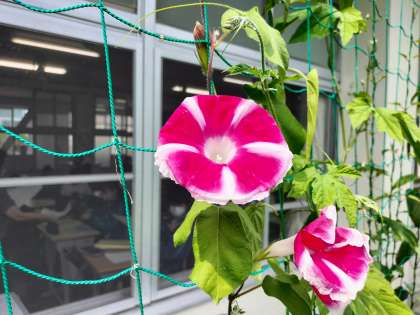 1年生の教室前の花壇に設置され、成長を続ける緑のカーテン。キュウリやカボチャなどのツル科の植物は、技術科の栽培の授業でも教材となっています。