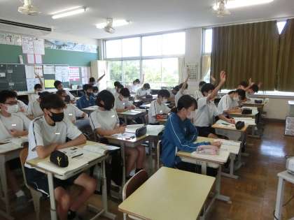 7/4 学習の深化 3 公開日 2023/07/04 更新日 2023/07/04 各学年から 昨日の3年2組の社会・公民分野の授業の様子です。 日本国憲法の基礎について学んでいました。 歴史分野で学んできた内容を復習しながら、いよいよ細かな部分まで学習を深めていきます。