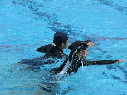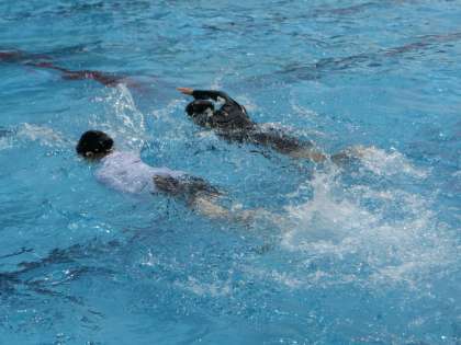 美しいフォームでのクロールをマスターするため、仲間と教え合いながら練習していました。