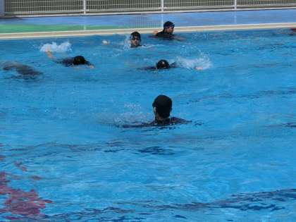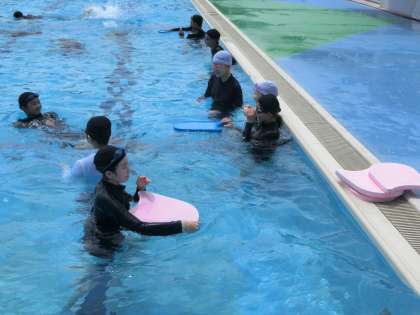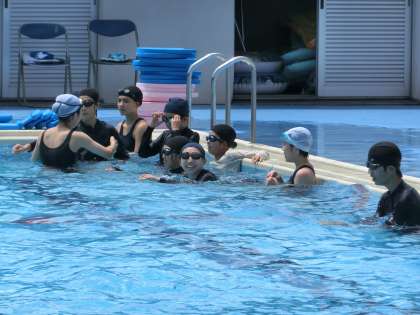 美しいフォームでのクロールをマスターするため、仲間と教え合いながら練習していました。