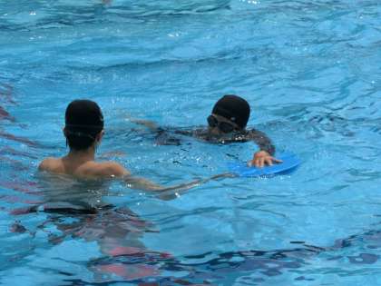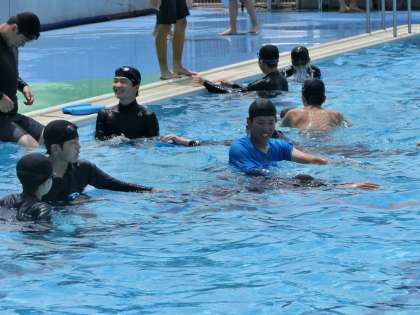 美しいフォームでのクロールをマスターするため、仲間と教え合いながら練習していました。
