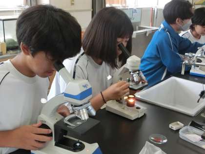 顕微鏡を使い、細胞分裂の様子を観察していました。