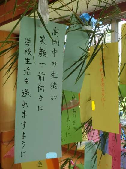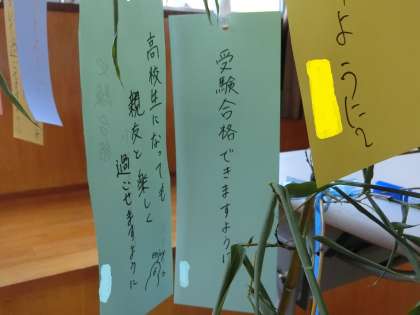 各自が重い思いを願い事を書き込む中、やはりその多くは受験に対するものです。一方、周りの人のことが内容の願い事もちらほら見られ、素直な生徒の思いがたくさん飾られています。