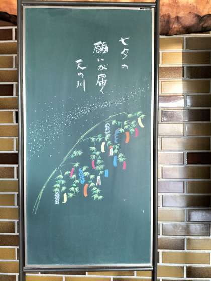7/6 リニューアル 公開日 2023/07/06 更新日 2023/07/06 校長室から 来客用玄関のメッセージボードのイラストが7月用(七夕バージョン)に描き変えられました。 チョークだけで描かれるイラストにいつも感心してしまいます。