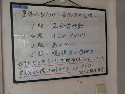 7/6 無駄じゃない… 公開日 2023/07/06 更新日 2023/07/06 各学年から 今日のホワイトボードメッセージです。 夏休みに向けて各クラスの目標が紹介されています。そしてその下にはイチロー選手の名言も紹介されています。 「無駄だと思うことって、結局無駄じゃないっていう考え方が僕は好きです」 この言葉から何かを感じ取ってほしいと思います。
