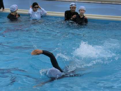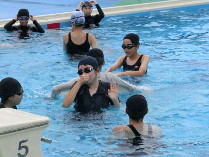 テストが終わった後も、クロールの技術をさらに上げようと練習したり、次回の平泳ぎのテストに向け、練習を始めている生徒もいました。仲間のアドバイスを受け、意欲的かつ楽しく活動に取り組んでいました。