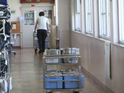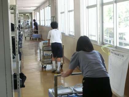 4時間目に授業のない先生たちが、終了間際になると職員室から各学年のフロアに繰り出していきます。配膳室から給食のワゴンを各クラスの廊下まで運ぶためです。